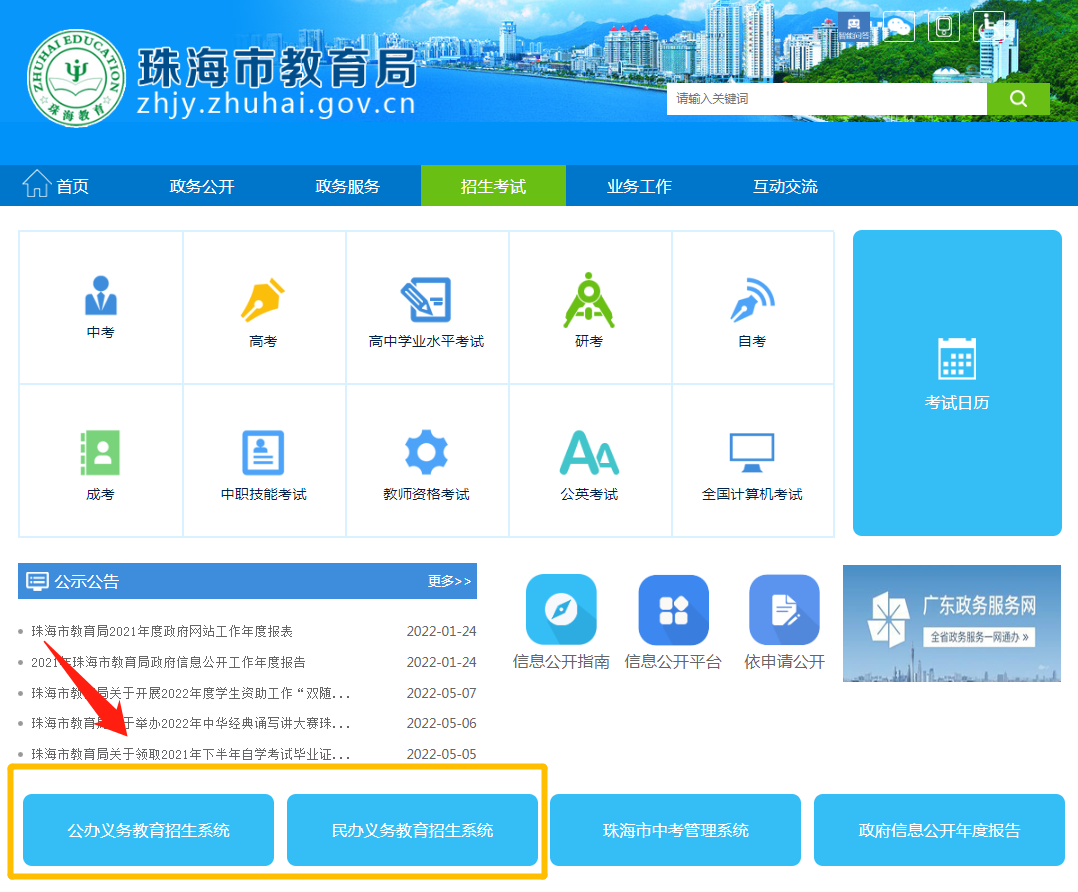 登录“珠海市教育局”官网(网址:http://zhjy.zhuhai.gov.cn/),点击网页左下方招生系统按钮,即可跳转至报名系统页面。
