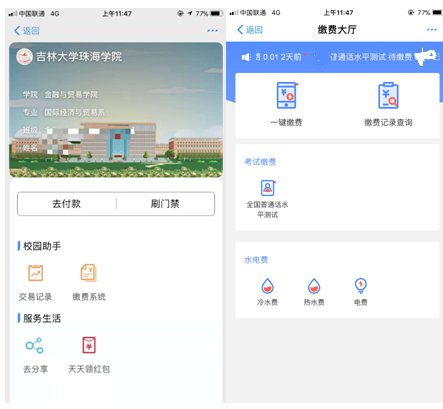 (2)打开支付宝(已领卡用户)进入卡包;选择珠海科技学院电子校园卡;进入主界面;选择“缴费系统”;选择“考试缴费”——“普通话水平测试”,点击“确认支付”至支付完成即可。