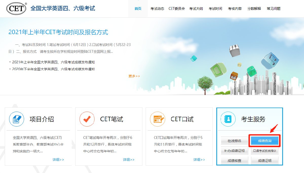 考生点击上方链接进入“中国教育考试网”官网后,在首页【考生服务】版块,点击【成绩查询】,进入查询系统;
