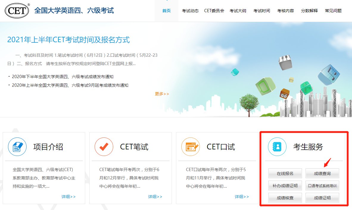 点击上方链接进入四六级考试官网后,在首页【考生服务】版块,点击【成绩查询】,进入查询界面;