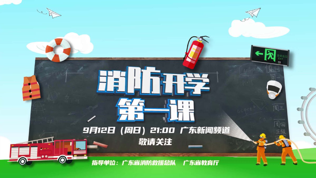 由广东省消防救援总队、广东省教育厅、广东广播电视台新闻频道联合摄制推出的《消防开学第一课》将于9月12日21:00开讲啦!