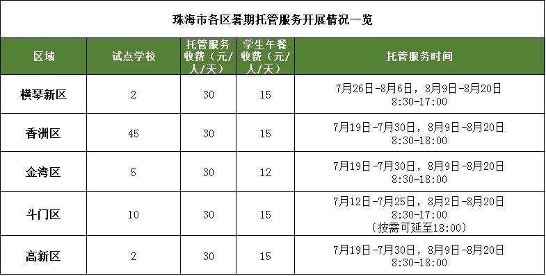 2021珠海市各区暑期托管服务开展情况一览