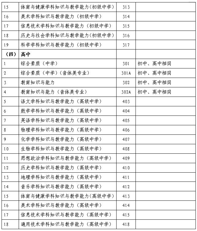 4.初级中学和高级中学的《学科知识与教学能力》科目按教育部有关规定执行。初级中学《学科知识与教学能力》科目分为语文、数学、英语、物理、化学、生物、思想品德、历史、地理、音乐、体育与健康、美术、信息技术、历史与社会、科学等15门科目,高级中学《学科知识与教学能力》科目分为语文、数学、英语、物理、化学、生物、思想政治、历史、地理、音乐、体育与健康、美术、信息技术、通用技术等14门科目。