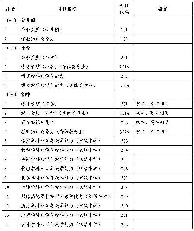 7.音、体、美专业考生的笔试公共科目一、科目二(科目代码:201、202、301、302)实行单独编码(相应科目代码:201A、202A、301A、302A),考试内容暂与原科目相同。音、体、美专业考生在笔试报名时应选报单独编码的公共科目。取得科目201A、202A合格的考生,面试仅限于参加小学类别音、体、美专业科目;取得科目301A、302A合格的考生,面试仅限于参加初中、高中、中职类别音、体、美专业科目。考生已获得科目201、202、301、302合格成绩,可相应替代科目201A、202A、301A、302A合格成绩;考生已获得科目201A、202A、301A、302A合格成绩不可替代科目201、202、301、302合格成绩。
