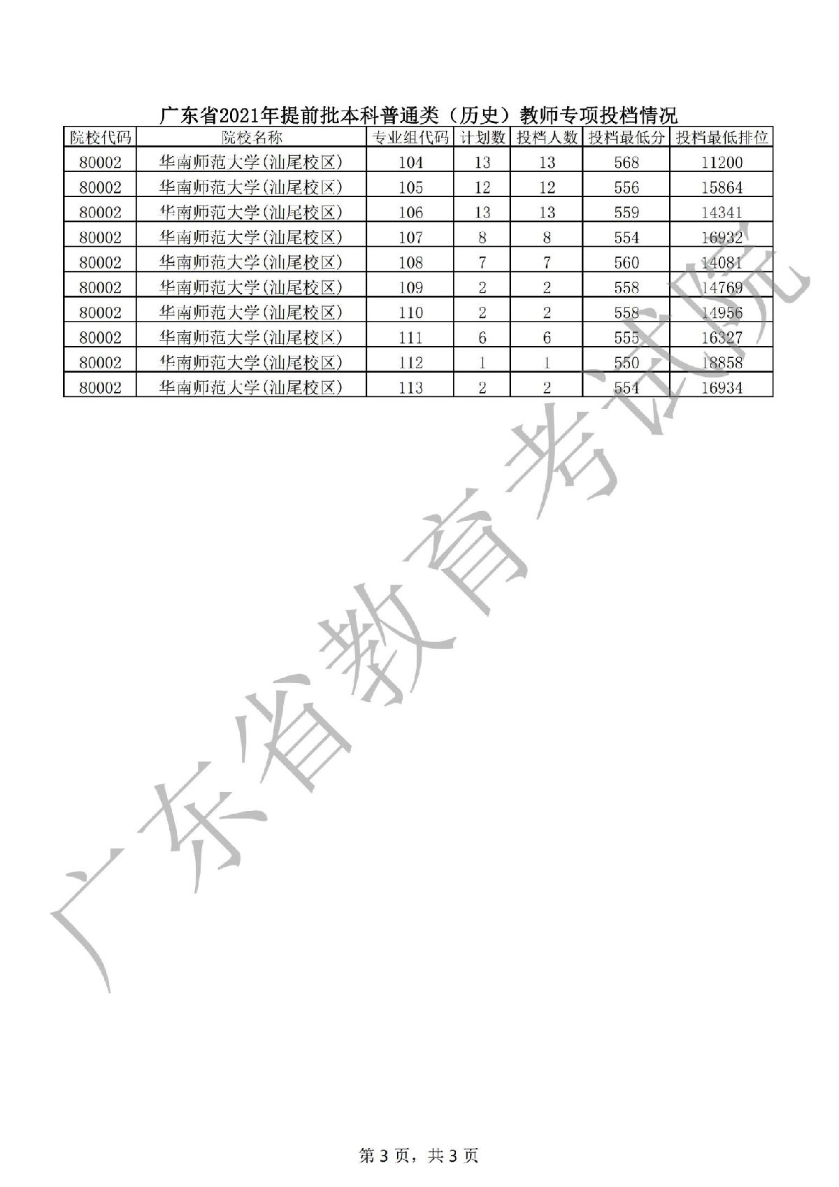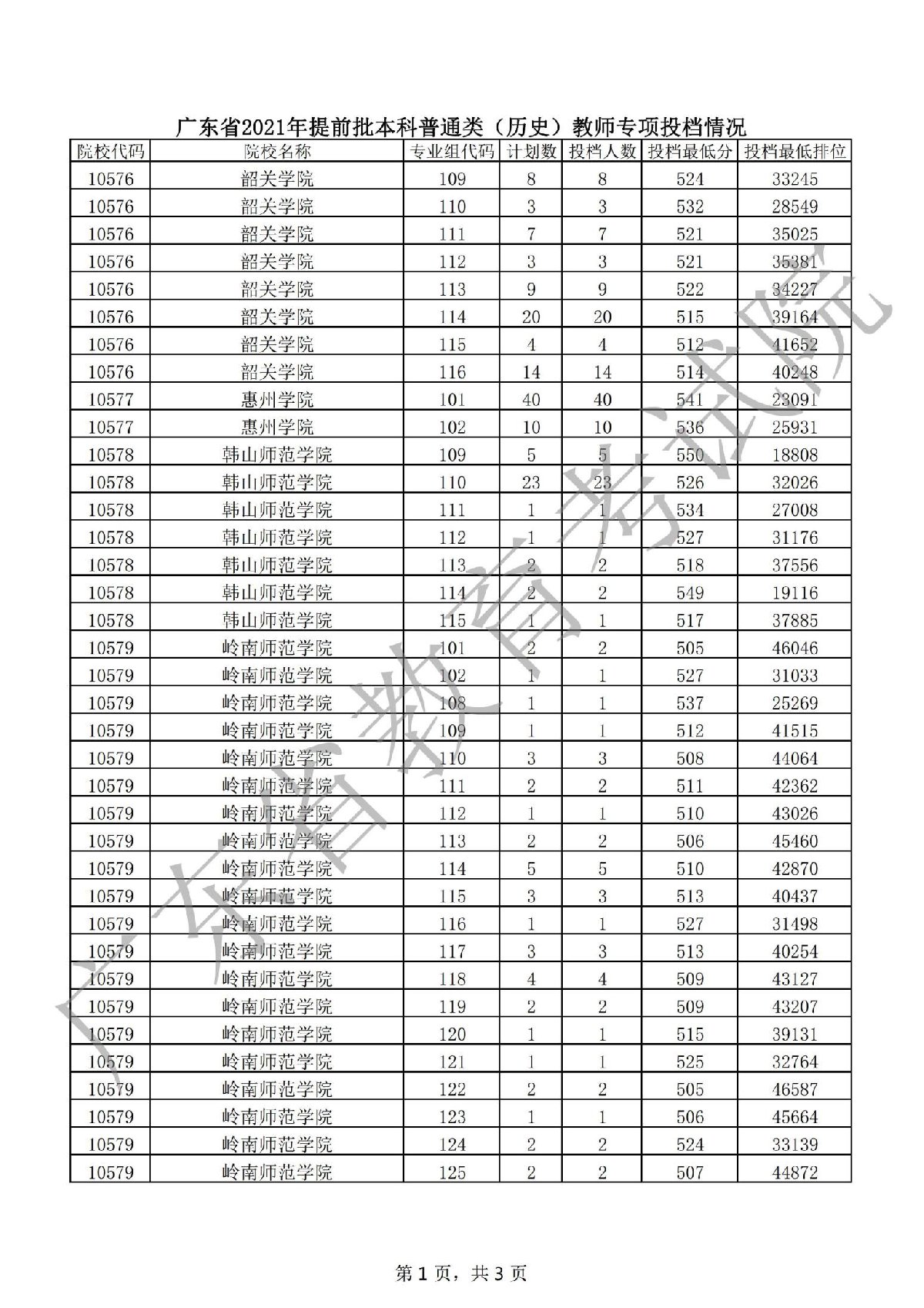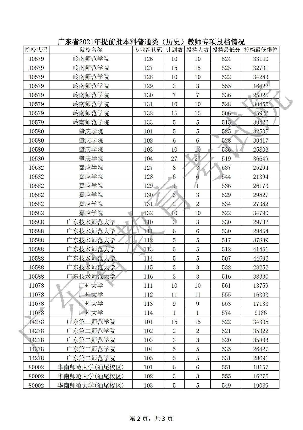 广东省2021年提前批本科普通类(历史)教师专项投档情况