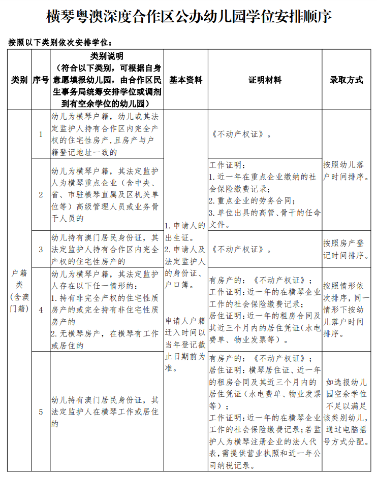 | 小班 | 须为2022年8月31日前满三周岁(即2018年9月1日至2019年8月31日出生)的适龄幼儿 | 横琴中心幼儿园、首都师范大学横琴子期实验幼儿园 预登记:荔枝湾小区配套幼儿园(暂定名) | 1.具有横琴户籍或持有澳门居民身份证的适龄幼儿(详见附件1第1-5项) 2.符合珠海市和合作区规定的政策性照顾类适龄幼儿(详见附件1第6-8项) |