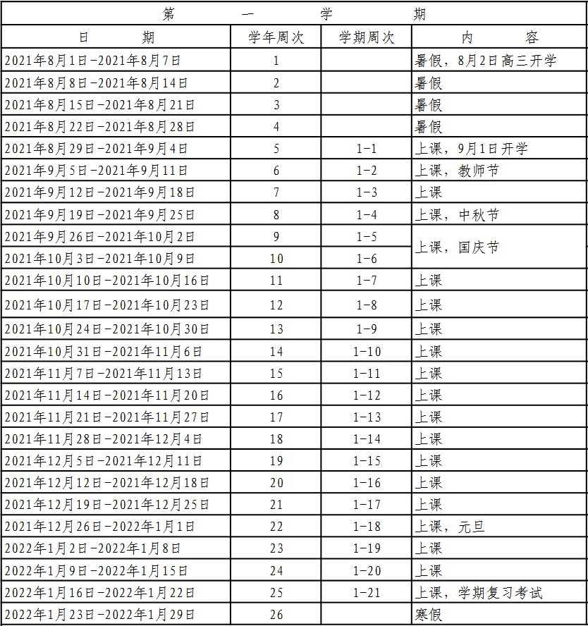 2.寒暑假、国家法定假日10周。寒假起始时间为2022年1月23日,暑假起始时间为2022年7月10日。国家法定节假日,执行国务院、省政府规定。