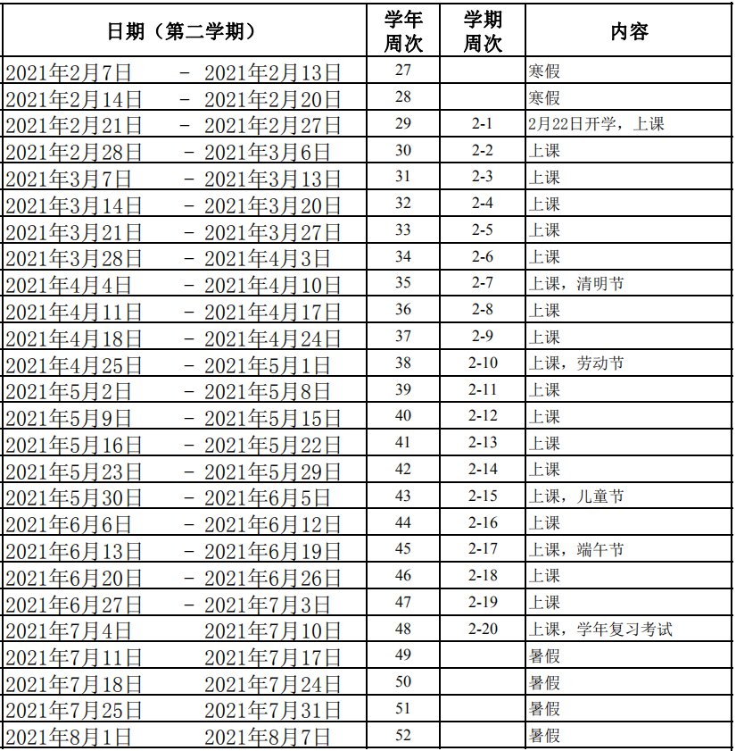 珠海中小学2020-2021学年第二学期校历 珠海校历表2020-2021年第一学期