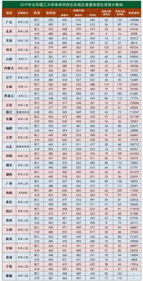 北京理工大学珠海学院历年录取分数线一览