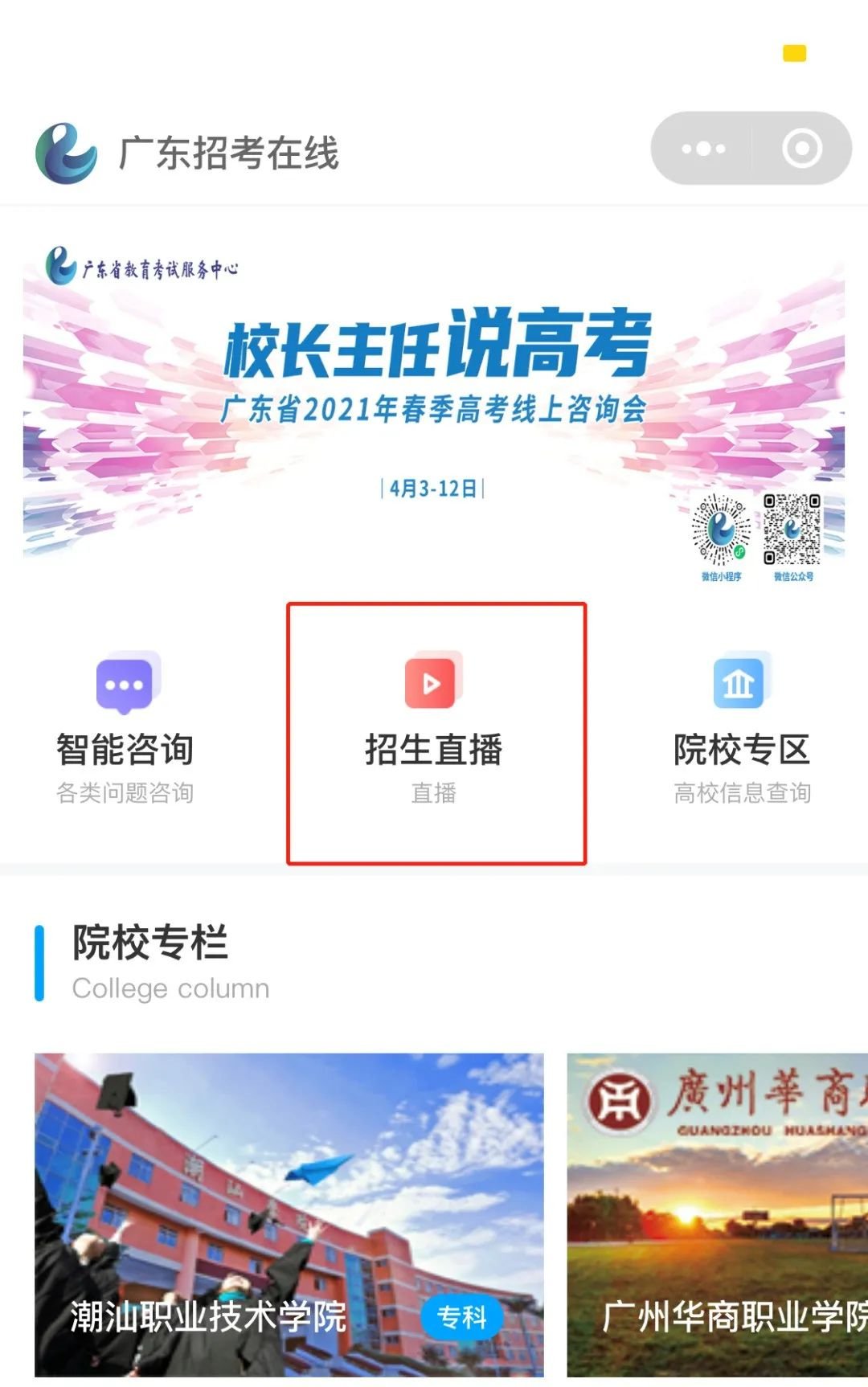 第一步:按小程序码快速进入“广东招考在线”小程序首页;