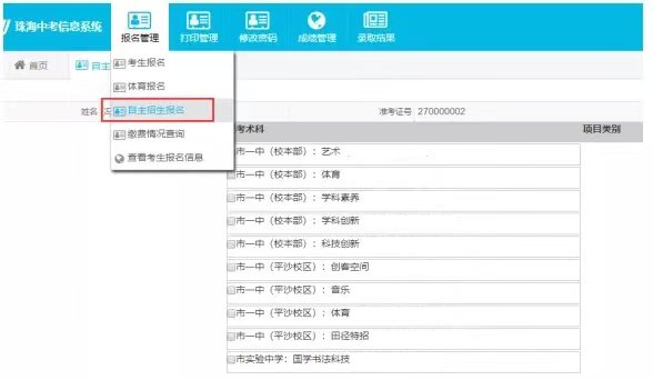 依次点击菜单“报名管理”“自主招生报名”,打开自主招生报名信息填写界面。勾选报考科目,点击“确定”按钮提交。