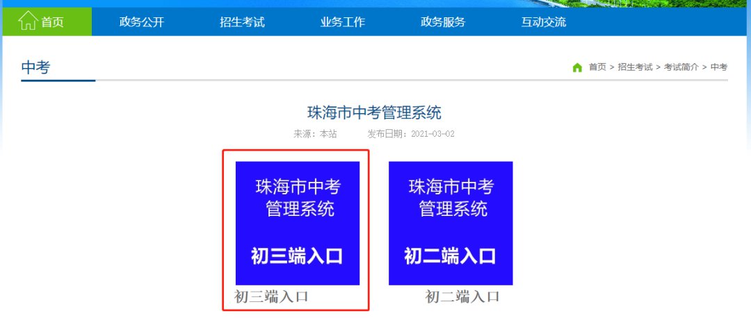 进入珠海市教育局官网(网址:http://zhjy.zhuhai.gov.cn/),点击页面下方“珠海市中考管理系统”,并选择入口,初三考生选择左边“初三端入口”。