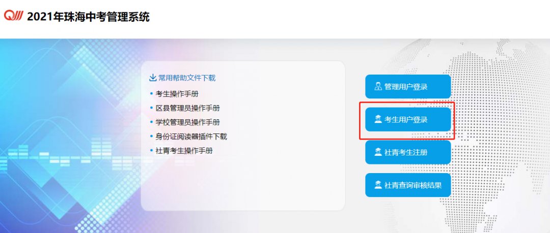 点击页面“考生用户登录”按钮,考生凭学校下发的准考证号和初始密码登录“珠海市中考管理系统”。