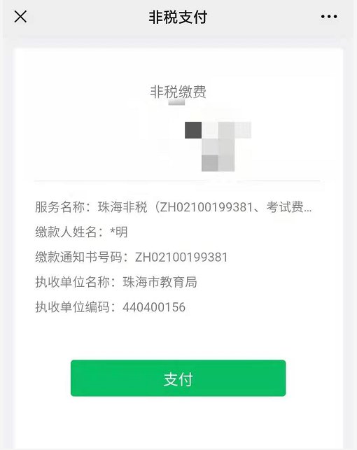 根据微信中缴费详情页面显示的金额支付费用,核对无误后,点击页面末端“支付”按钮。