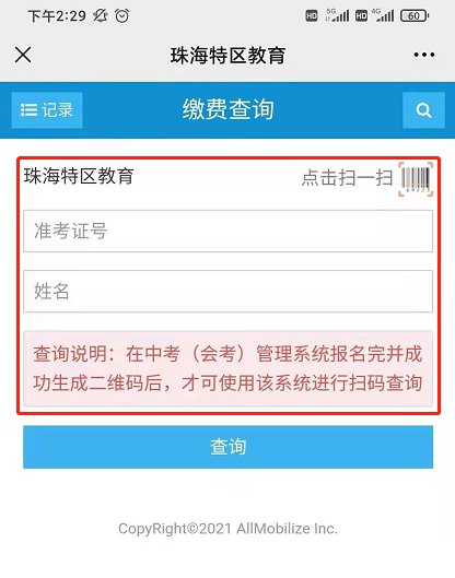 扫描电脑上中考管理系统中显示的考生个人缴费二维码,进行缴费。