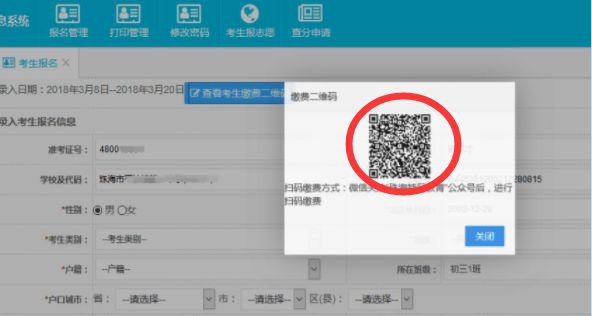 扫描电脑上中考管理系统中显示的考生个人缴费二维码,进行缴费。