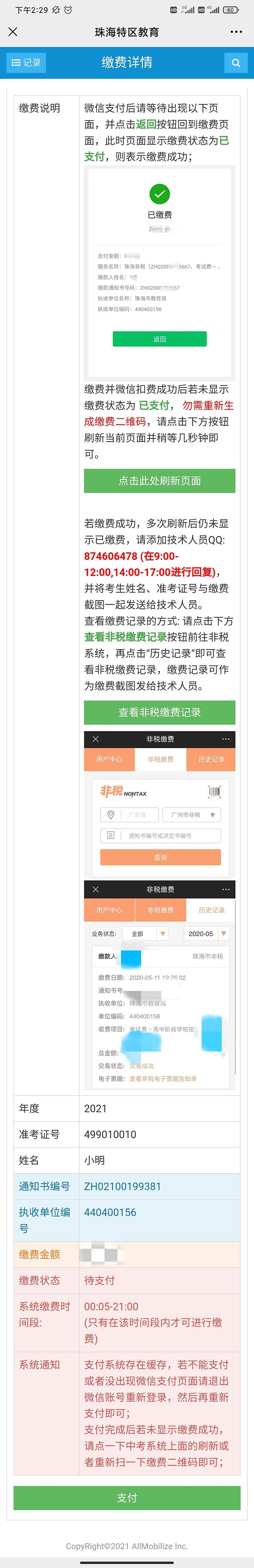 此外,也可以直接输入准考证号和姓名进行缴费。