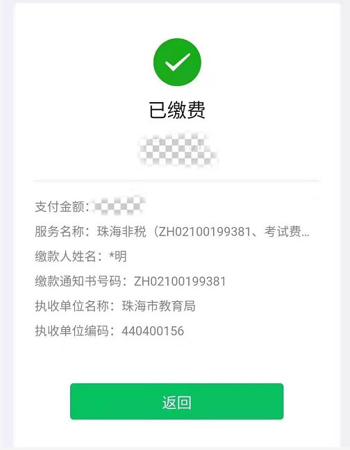 在“非税缴费页面”点击“确认+交款”,进行非税支付。随后点击新弹出页面的“返回”按钮,即可看到原先的缴费详情页面变为“已支付”状态。