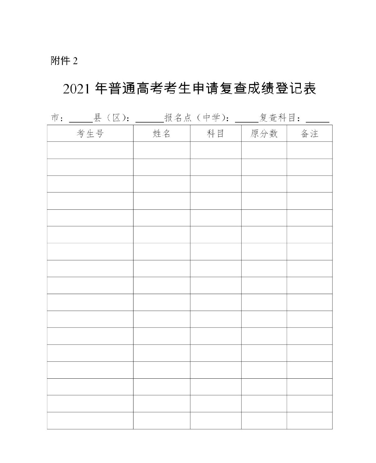 附:《考生申请复查普通高考各科目成绩登记表》样式