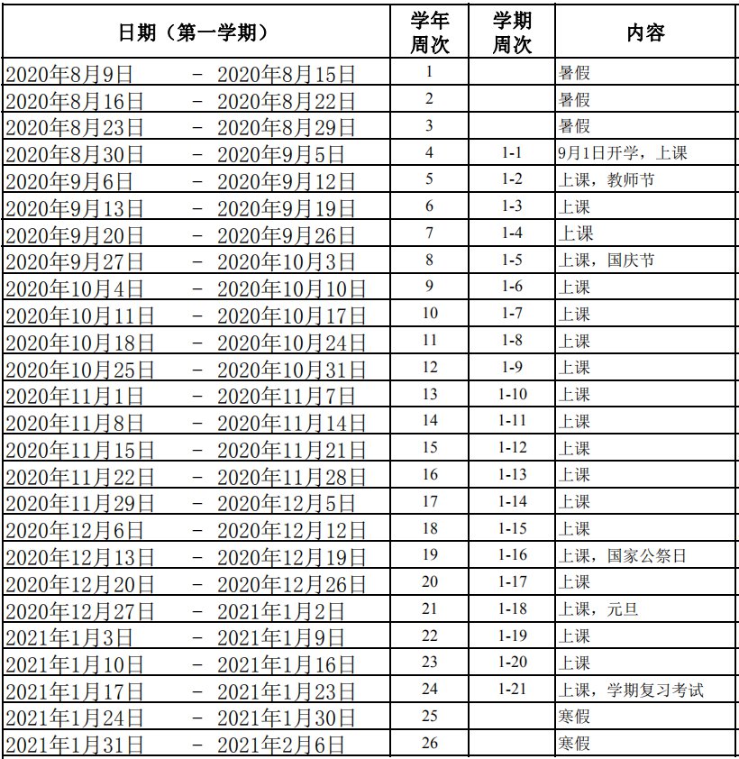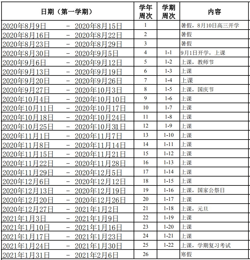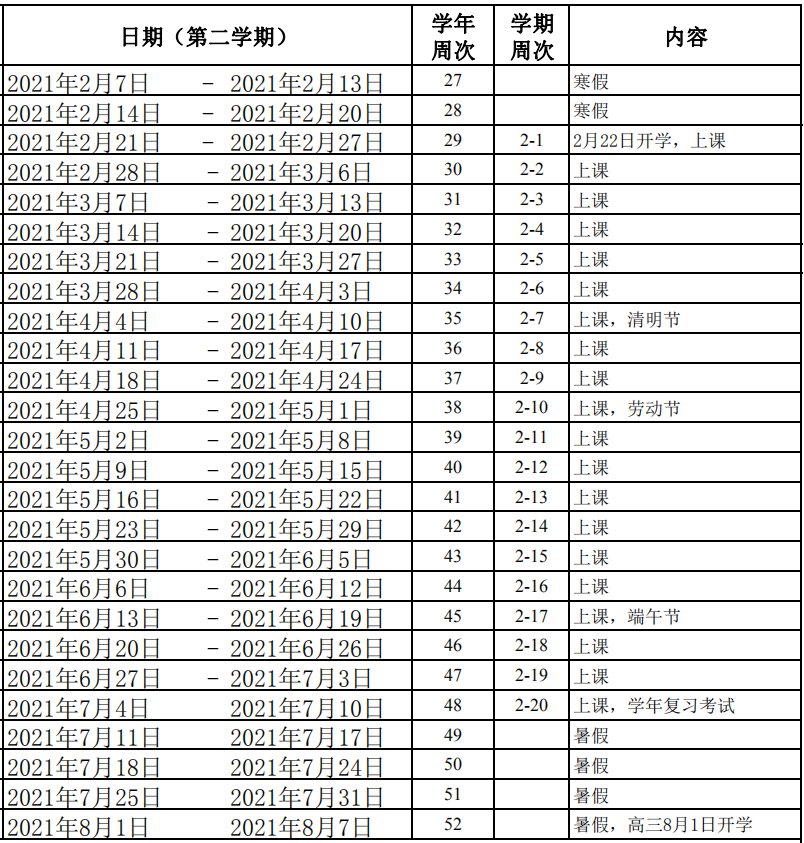2.寒暑假、国家法定假日10周。寒假起始时间为2021年1月31日,暑假起始时间为2021年7月11日。法定节假日,执行国务院、省政府规定。