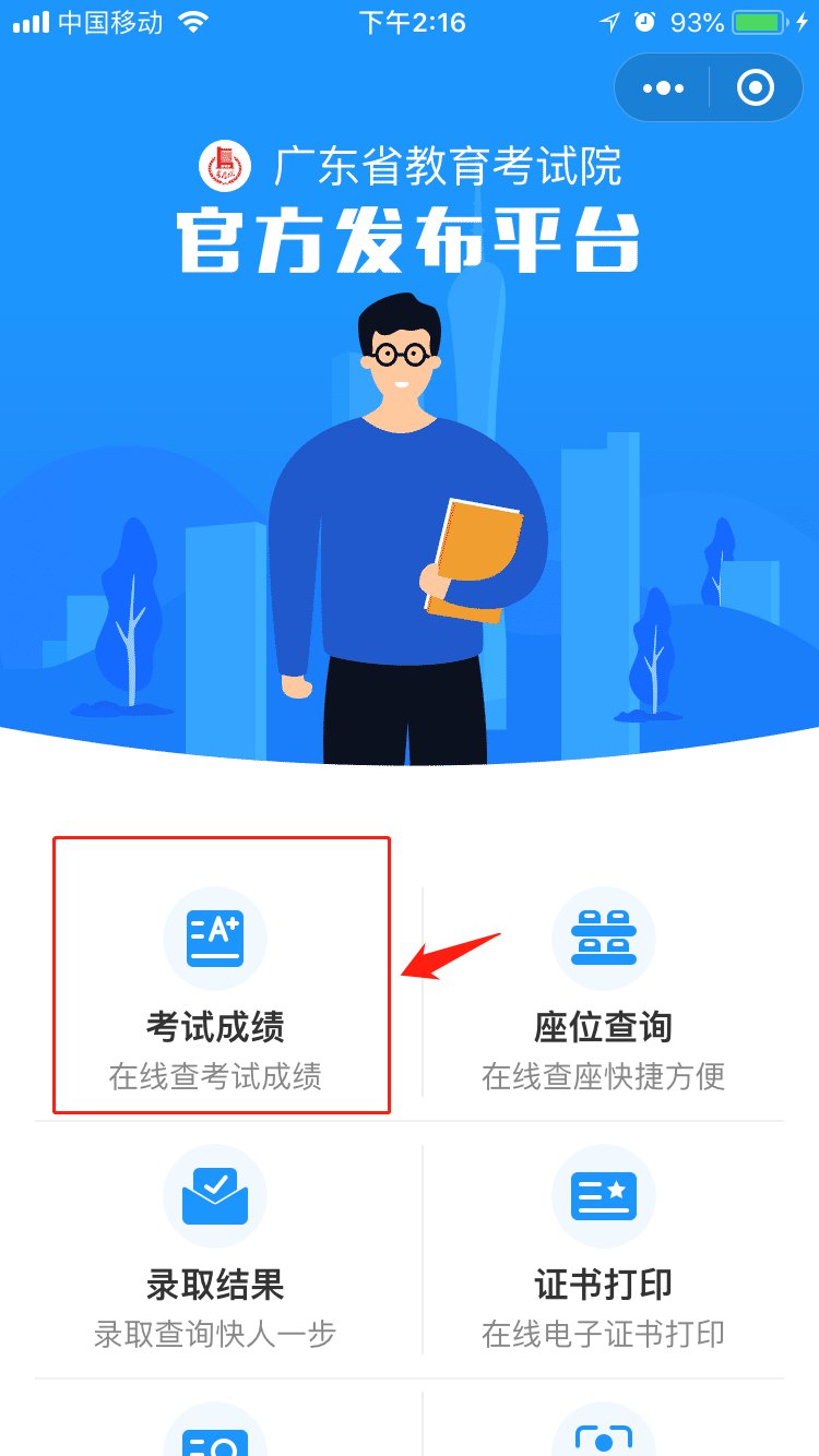 (一)点击上方链接进入“广东省教育考试院”微信小程序,点击【考试成绩】版块进入查询页面;