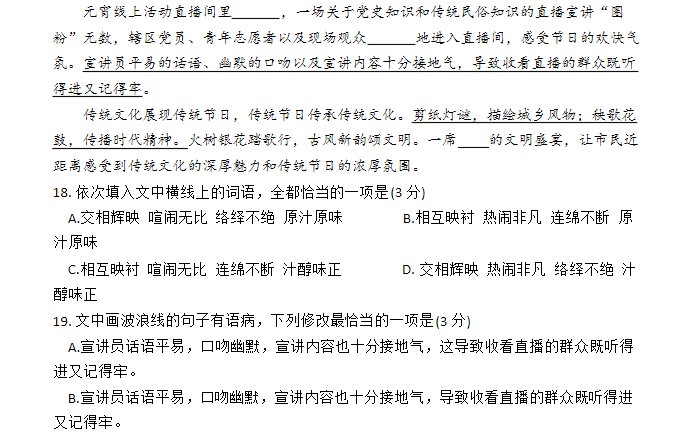 19.D【解析】首先看句式,句式结构要一致,平易的话语,幽默的口吻,十分接地气的宣讲内容句式是一致的偏正结构。其次看选词, “导致”后面往往跟的是不好的内容,坏的结果,所以选“使得”。