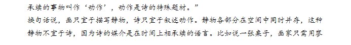 5.【答案】①材料中阐述了“诗画异质”的观点:绘画只宜于描写静物,因为一幅画仅能表现时间上的某一点,不可能超过一刹那内的物态和景象;而动作在时间上先后相承续,是一条绵延的直线,因此动作不宜于画。
