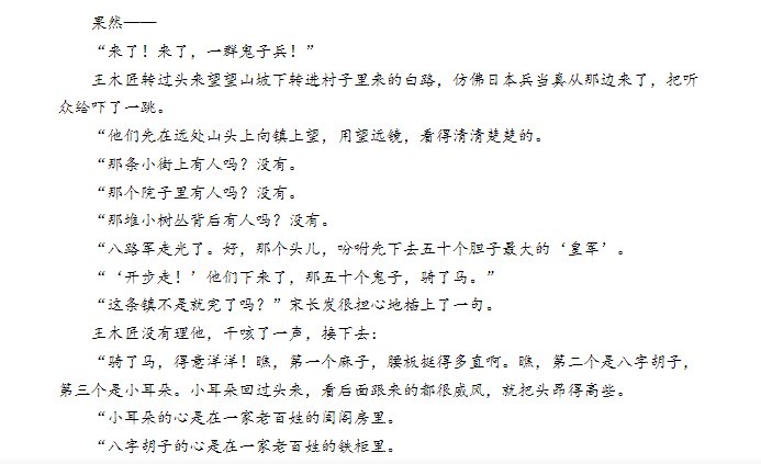 8.【答案】反复手法,在形式上可以抓住村民的注意力,引导听众的思绪,让听众跟着讲述者的节奏走,比如:“干咳了一声”“那条小街上有人吗?没有。那个院子里有人吗?没有。那堆小树丛背后有人吗?没有。”