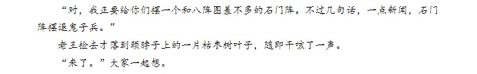 【解析】此题考查小说中“门”的含义,需要梳理文本,由浅入深思考。首先在文中找出写门的几处地方:“石门阵摆退鬼子兵”““他们什么也没有看见,只看见门里堵满了石头——石头门”“只要不是木头门就行了。木头门烧得开。上次苏家峪不是给门板都烧光了”“守住了大门,不用关二门。对,把我们的门板烧掉呢,我们就夜不闭户”“倒认真地想起当真到了处处夜不闭户的时代”。接着进行分类梳理,文中的“门”有三类:木门、石头门、没有门夜不闭户。最后再结合小说的主旨,分别写出这三类门的作用或深层意味。