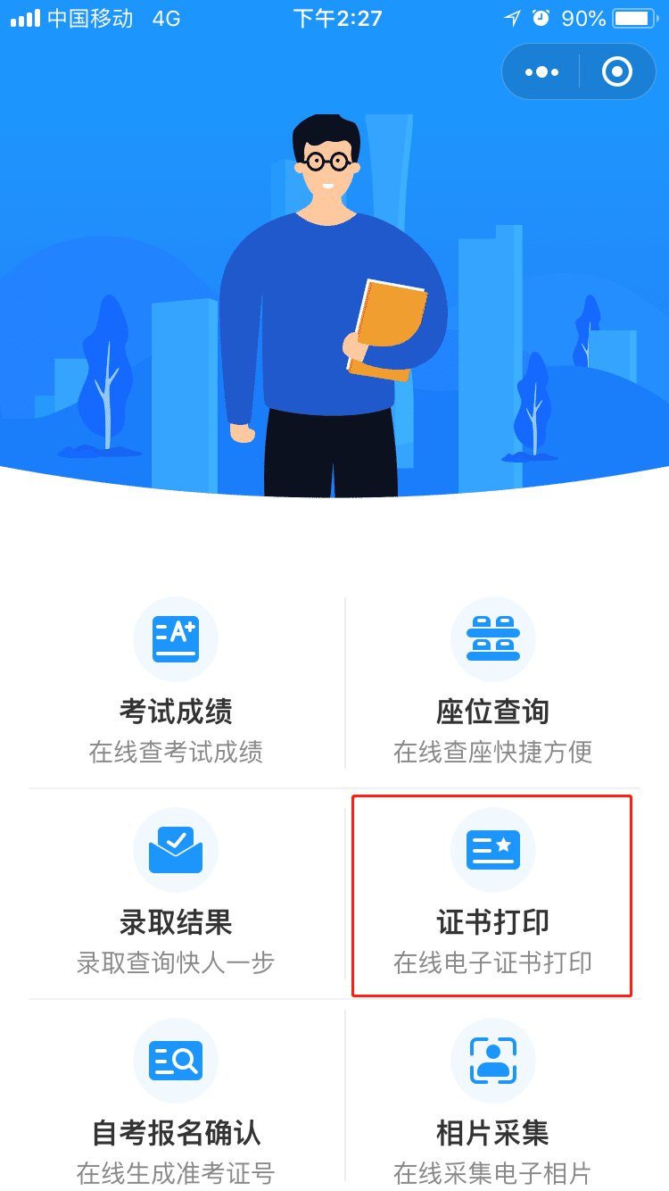 ☞微信搜索进入“广东省教育考试院”小程序,点击【证书打印】版块