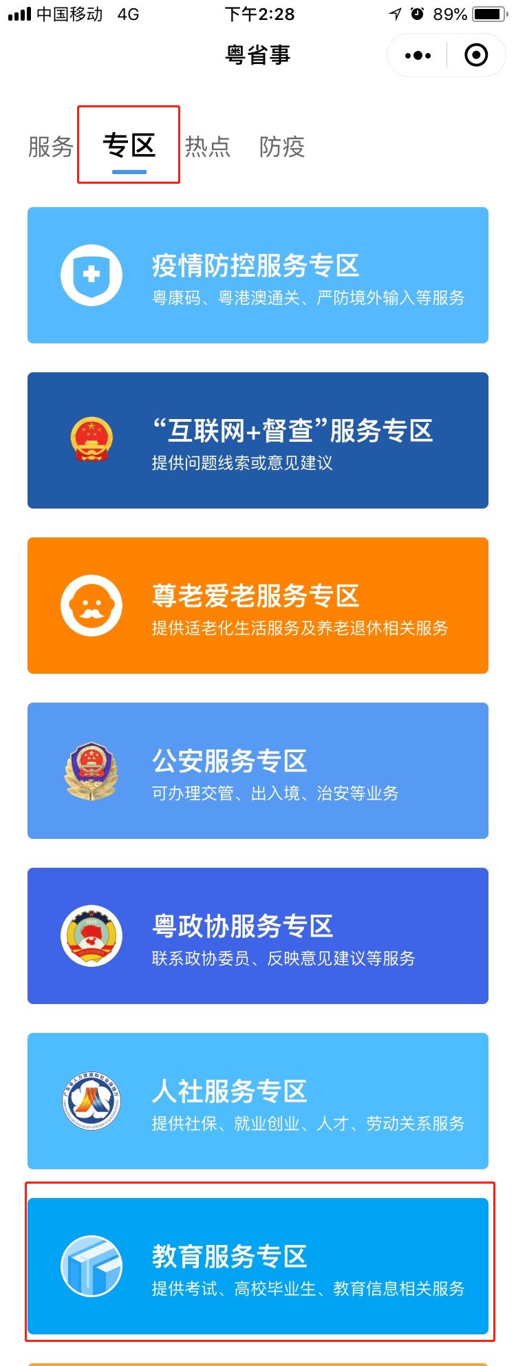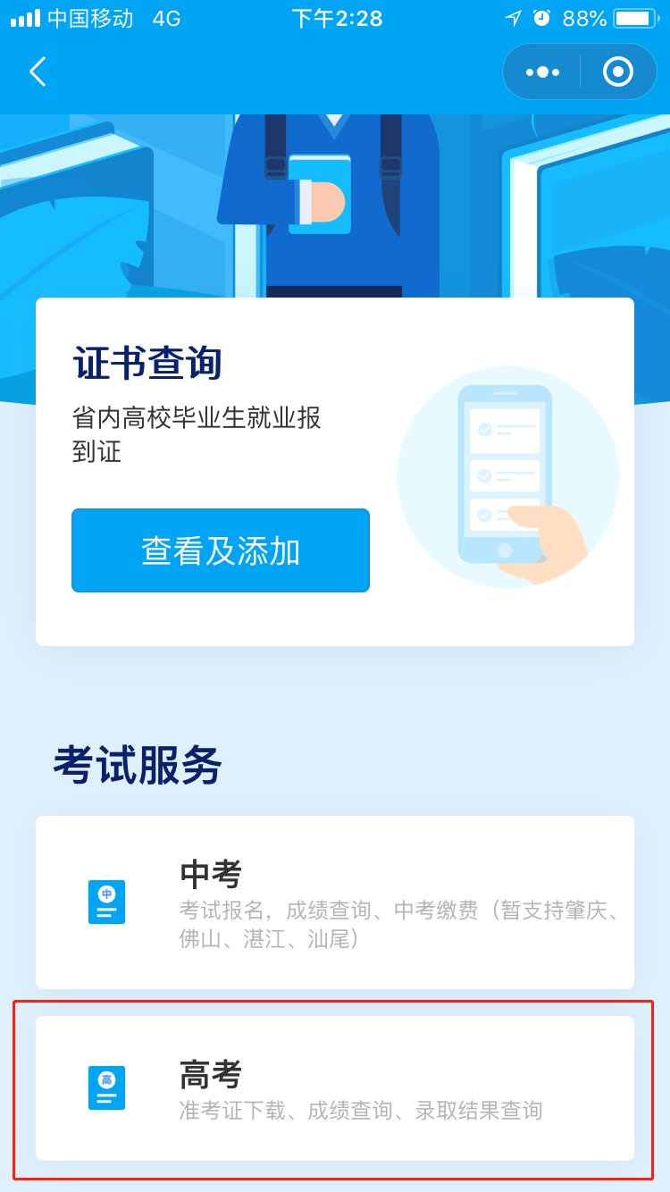 ☞微信搜索进入“粤省事”小程序,点击“专区”板块,选择“教育服务专区”,再选择“高考”