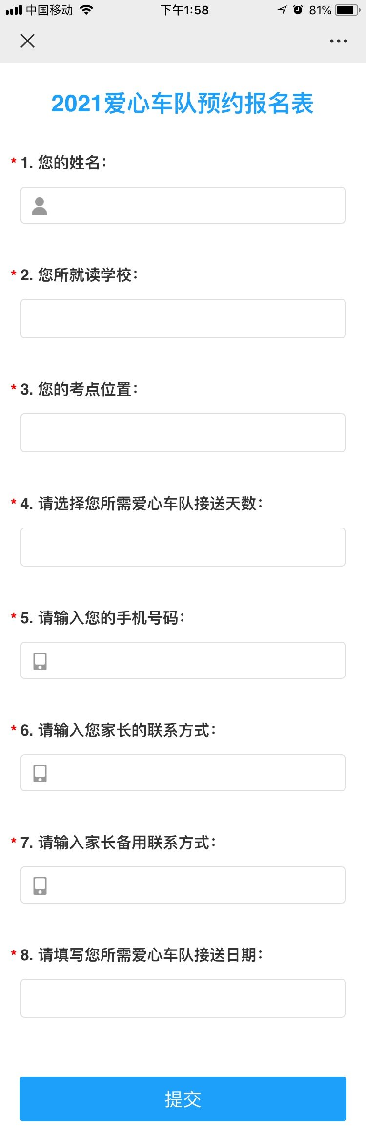 进入预约界面后,考生依次填写个人姓名、就读学校、考点位置、接送天数、联系方式及接送日期等信息,提交报名表,即完成预约报名。
