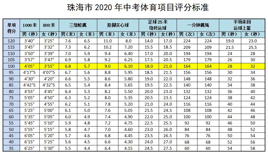 2020珠海中考体育评分标准 珠海中考体育项目及评分标准
