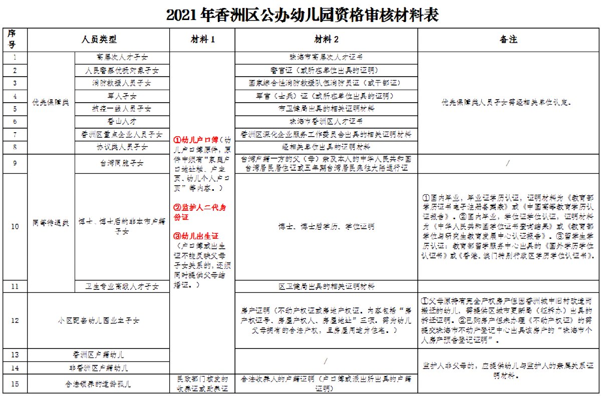 附件:《2021年香洲区公办幼儿园资料审核材料表》