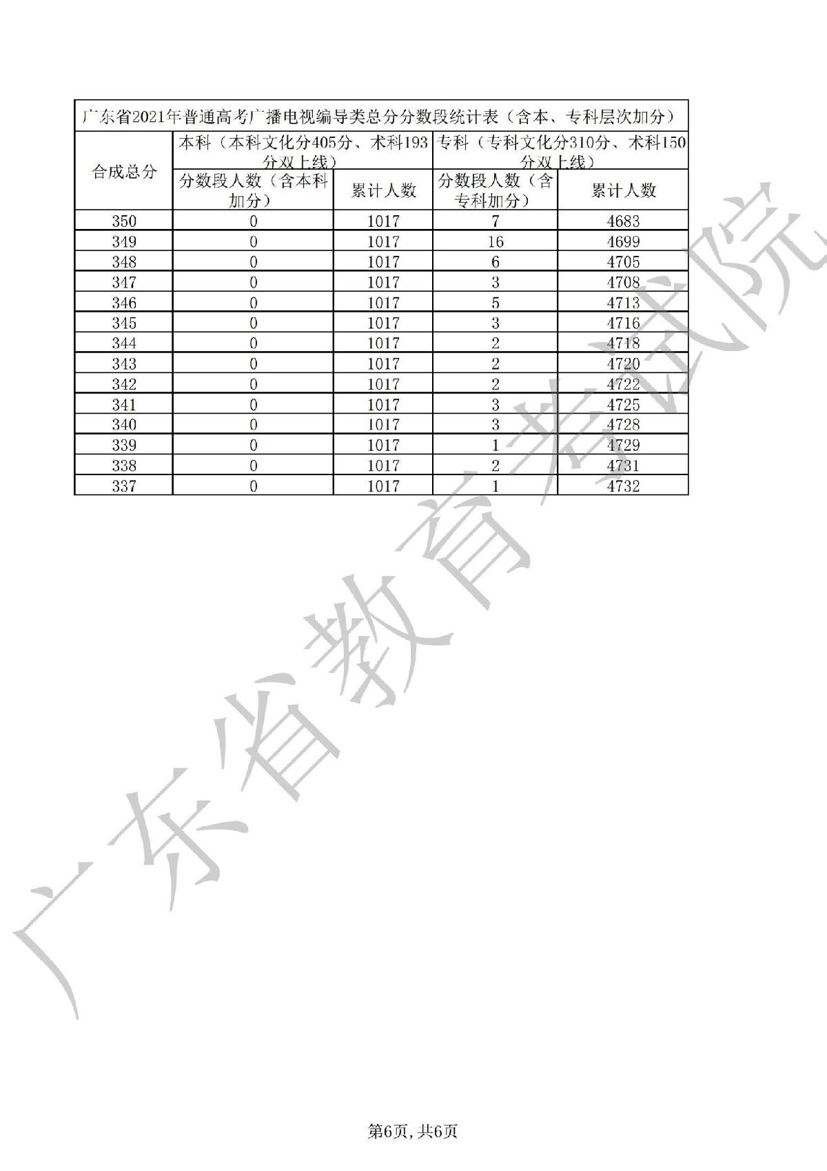 广东省2021年普通高考广播电视编导类总分分段统计表