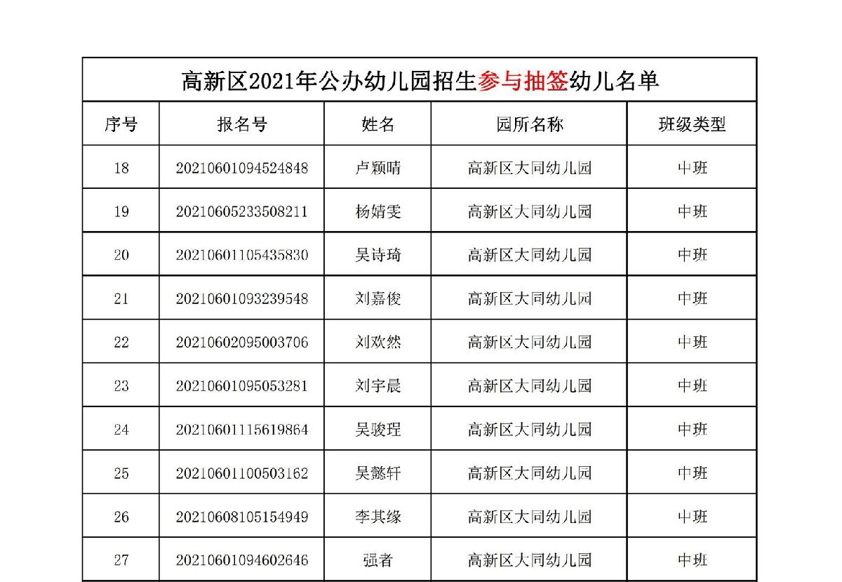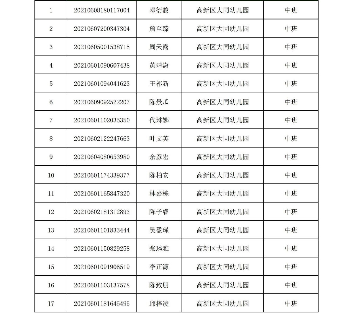 2021珠海高新区大同幼儿园招生参与抽签名单