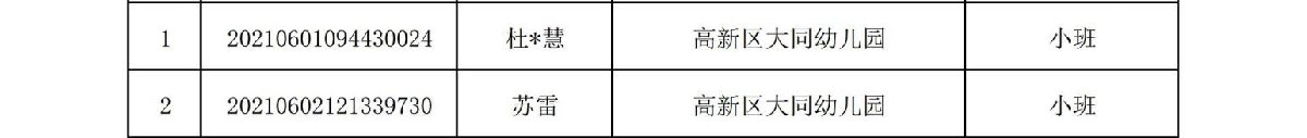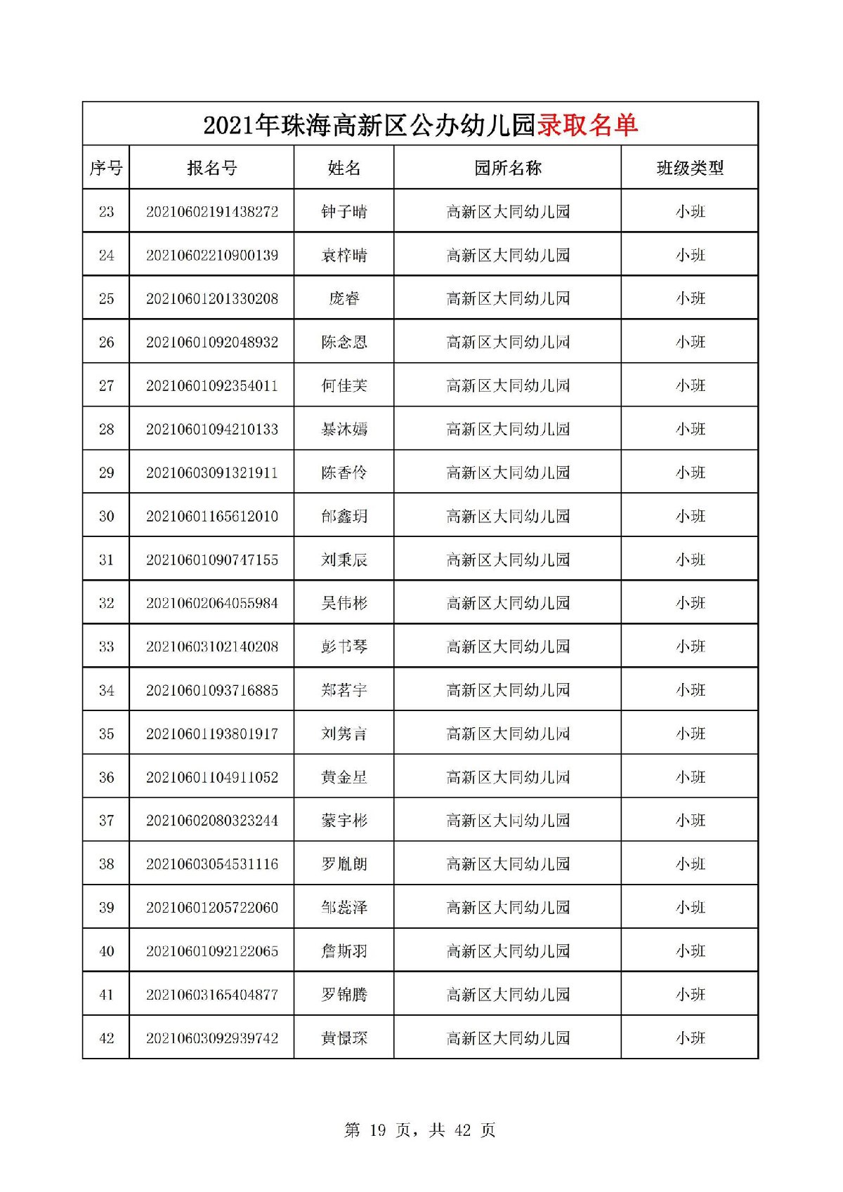 2021珠海高新区大同幼儿园录取名单