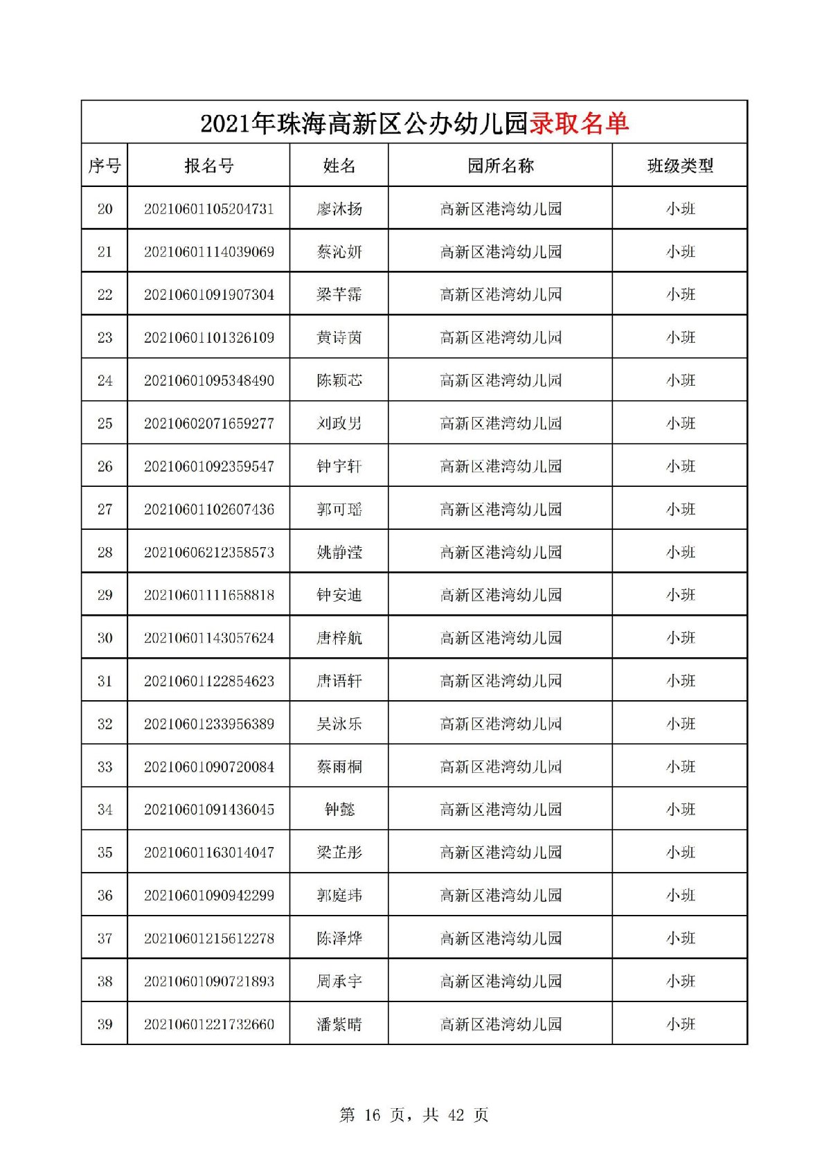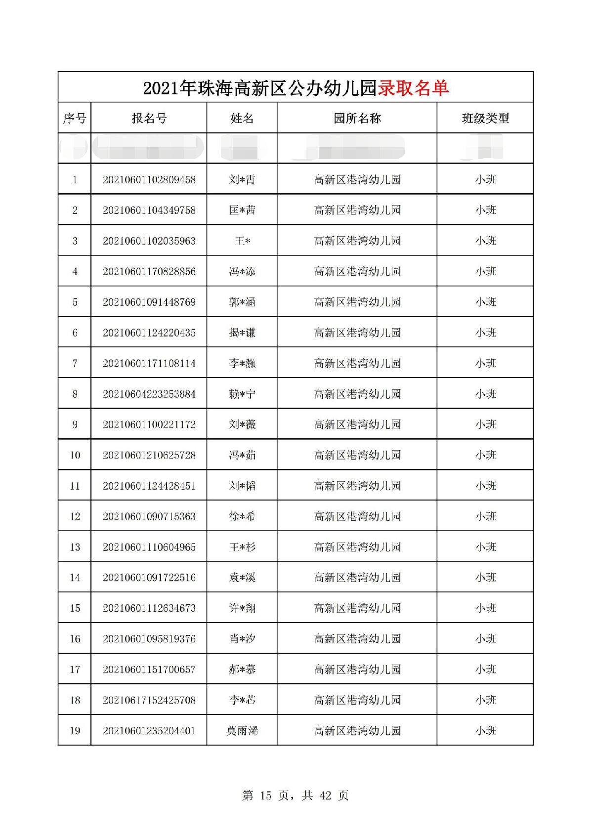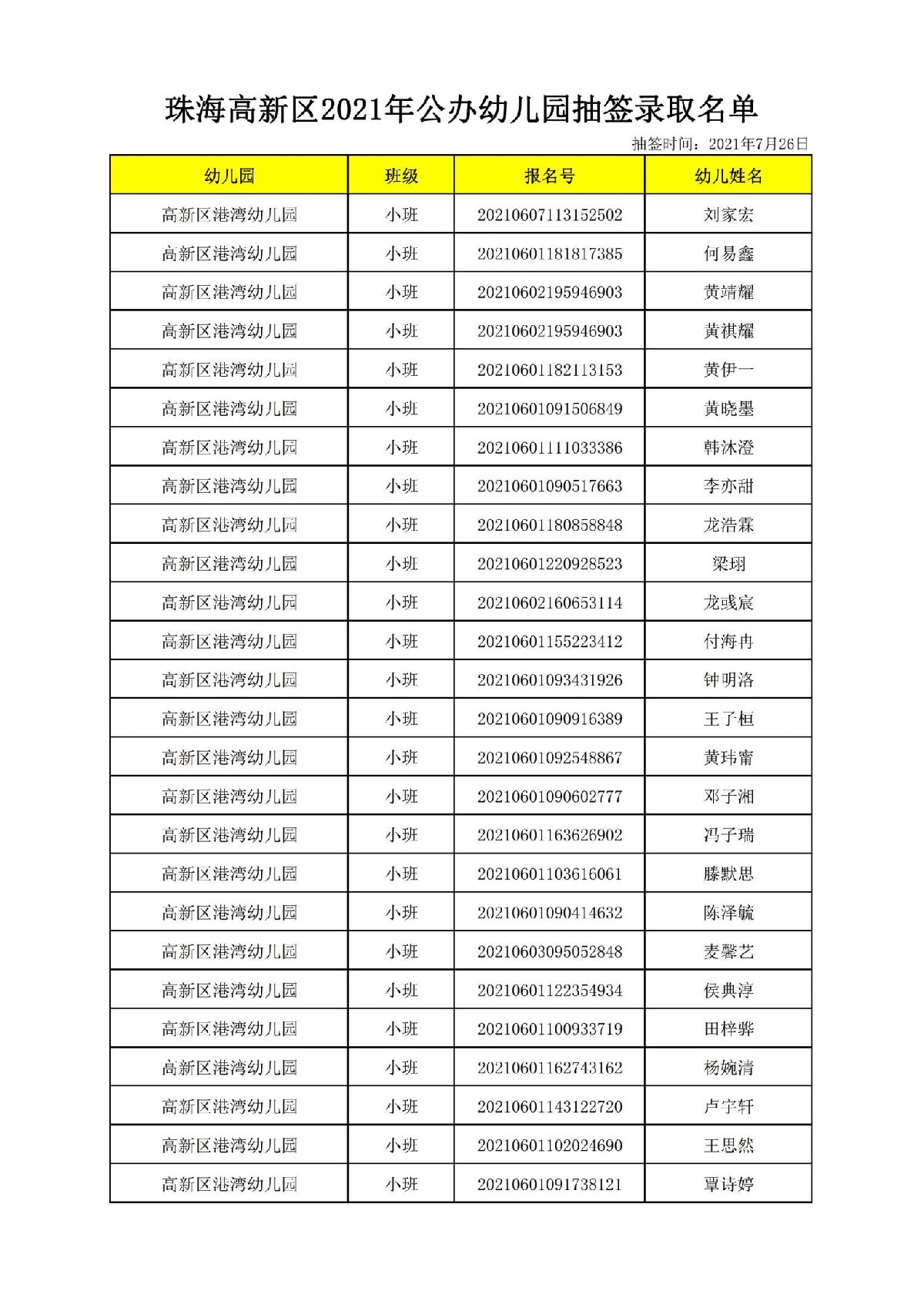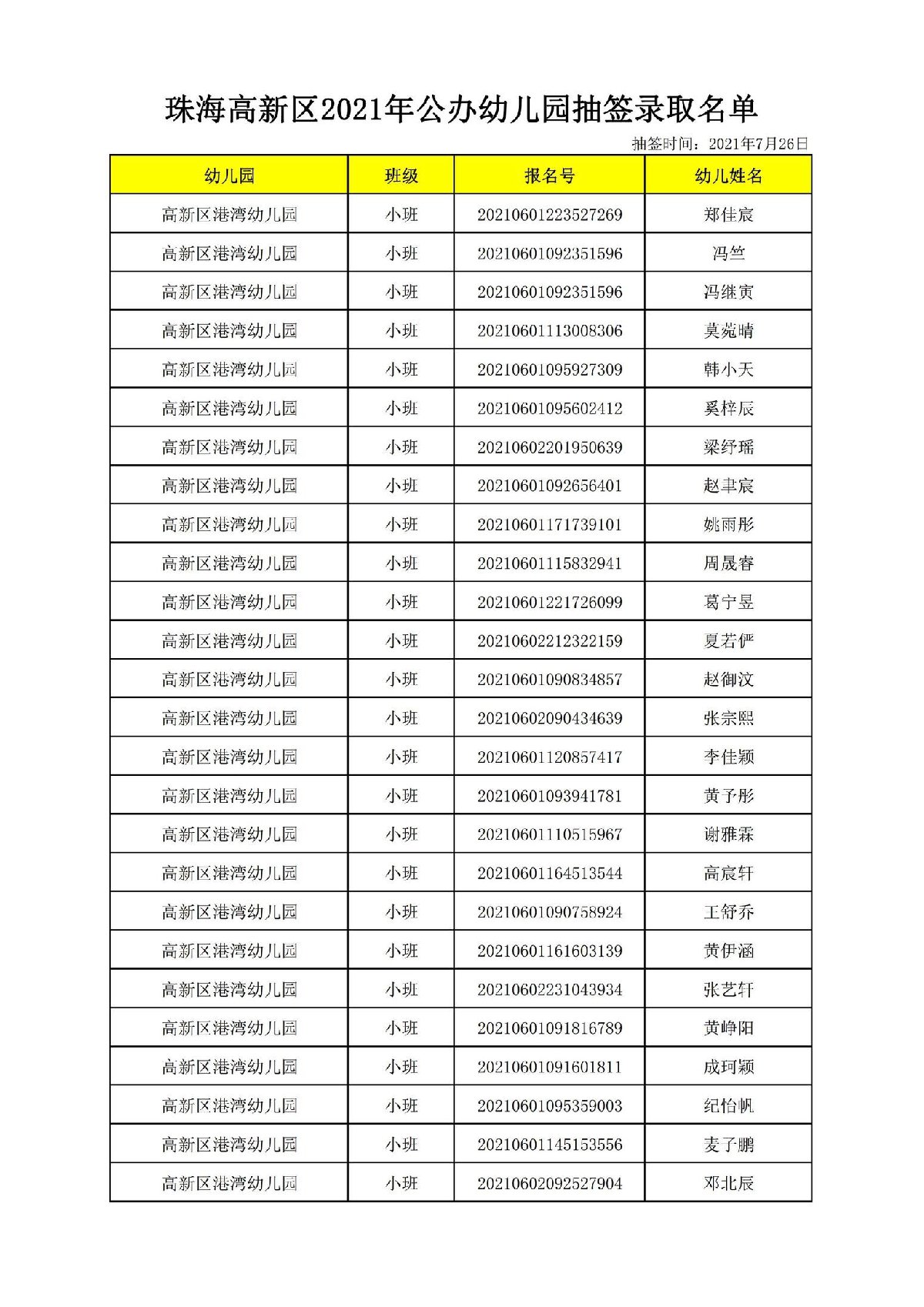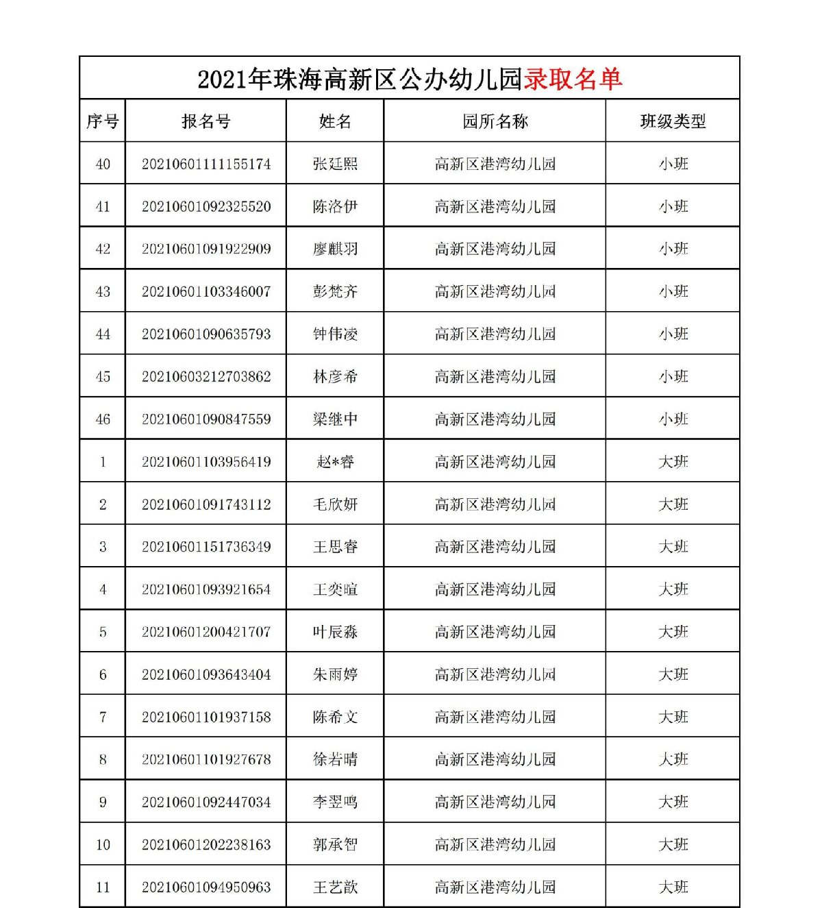 2021珠海高新区港湾幼儿园录取名单(珠海市高新区港湾幼儿园)
