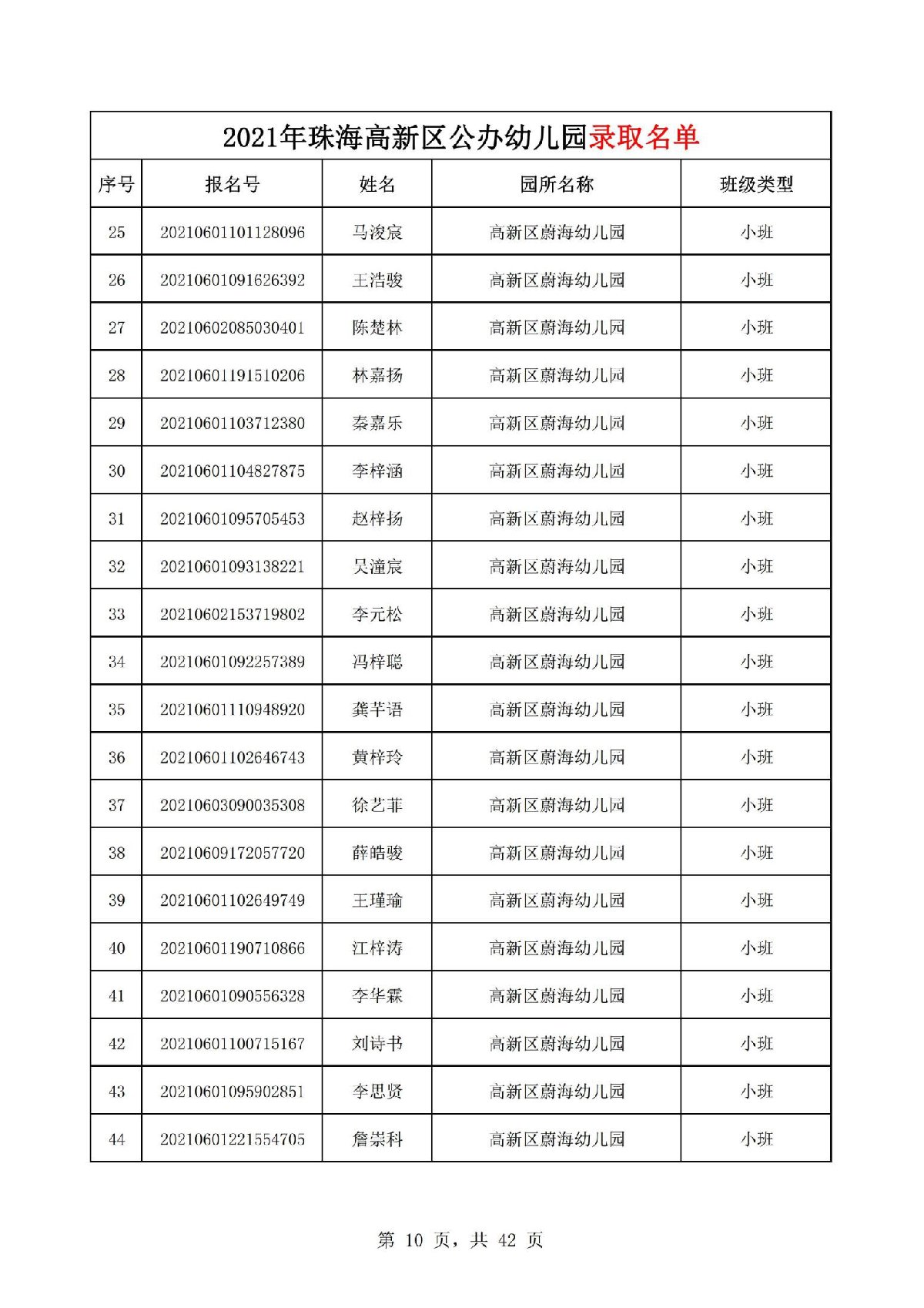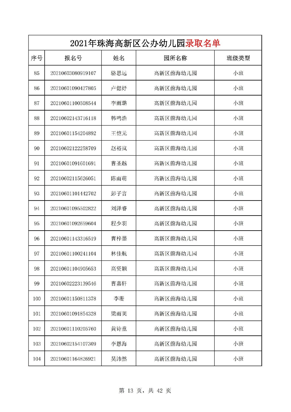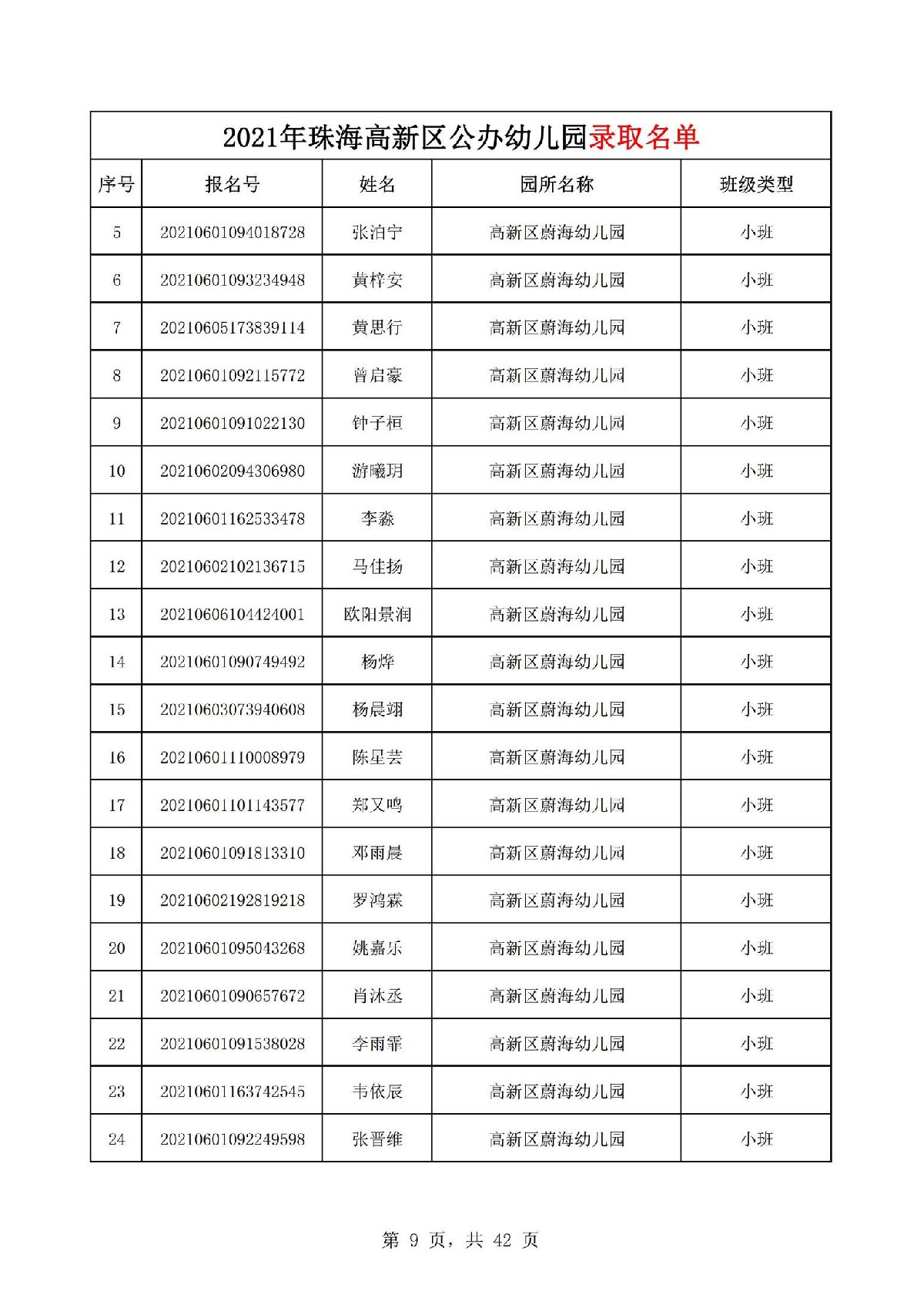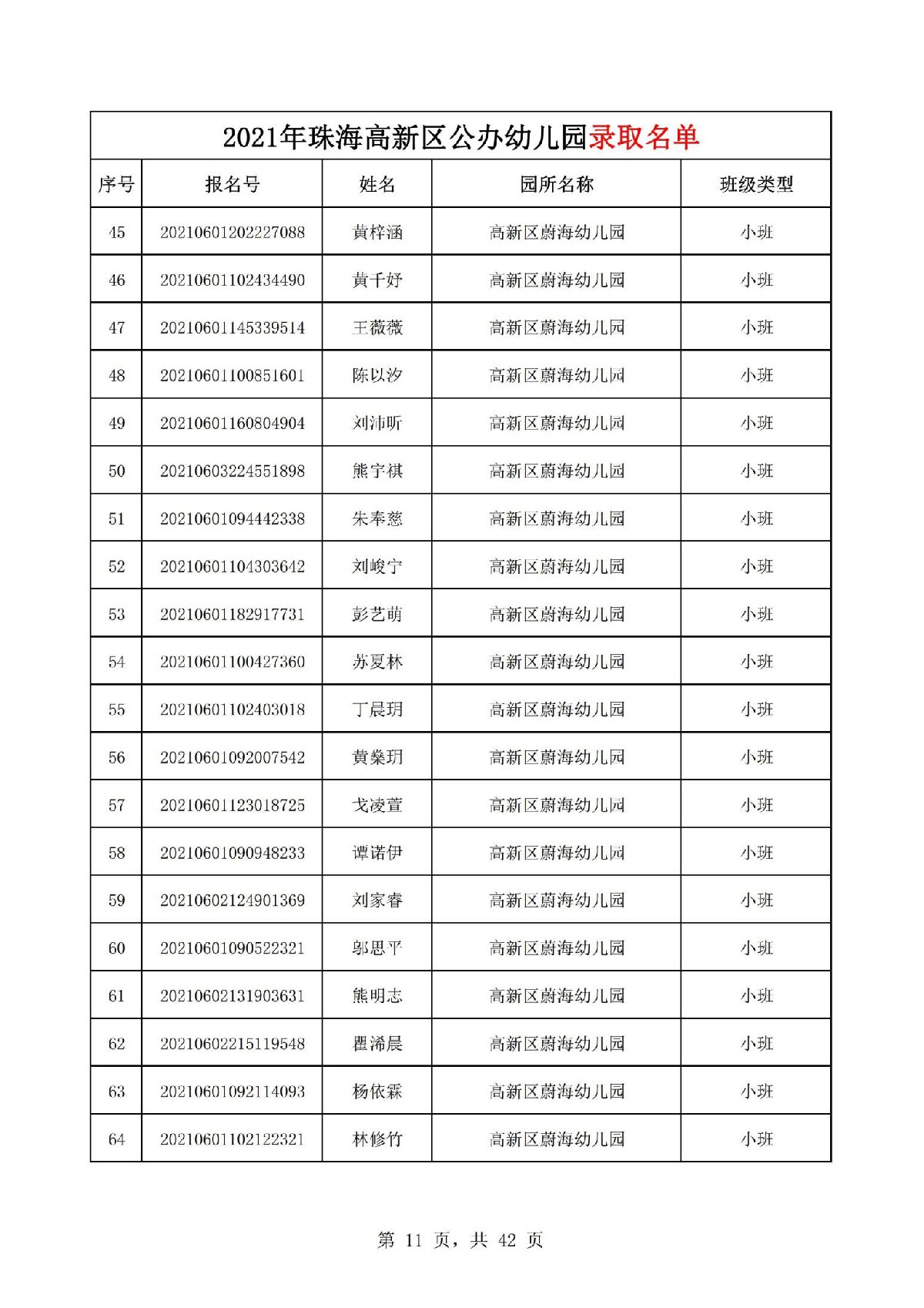 珠海高新区蔚海幼儿园2021秋季录取名单