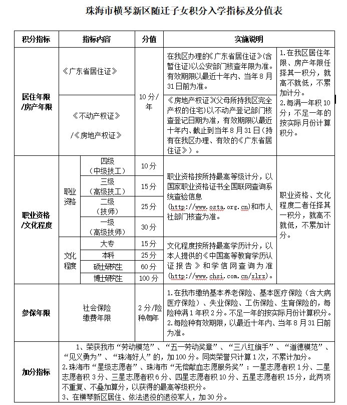 珠海市横琴新区随迁子女积分入学指标及分值表