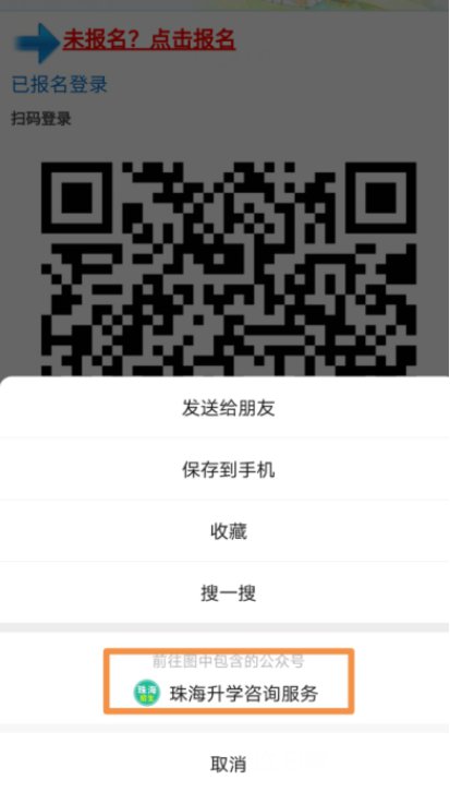 使用已绑定学生账号的微信,进入报名界面,点击“已报名扫码登录”,长按二维码图片进入公众号后,点击左上角的返回键即可登录。
