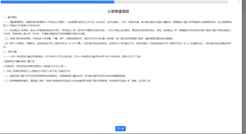 点击报名后,会出现珠海市义务教育招生报名诚信承诺书和入学须知等提示家长入学报名注意事项和时间安排。