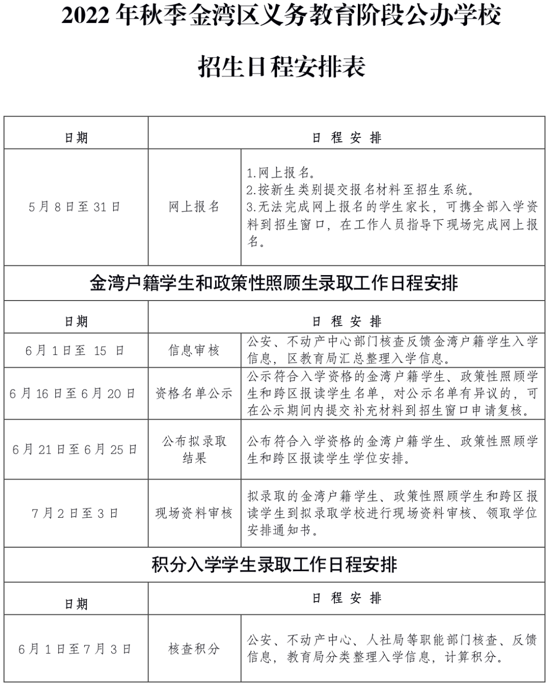附件8.2022年秋季金湾区义务教育阶段公办学校招生日程安排表