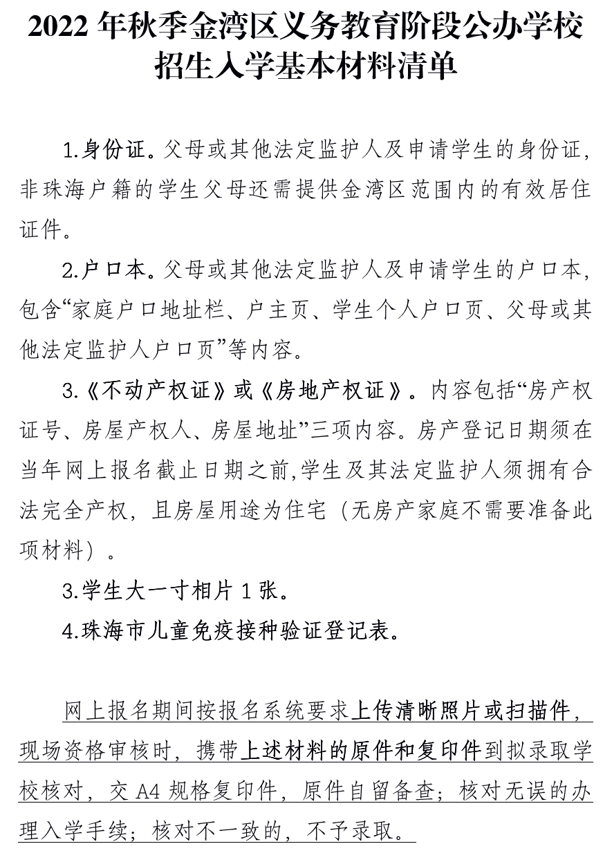 附件6.2022年秋季金湾区义务教育阶段公办学校招生入学基本材料清单