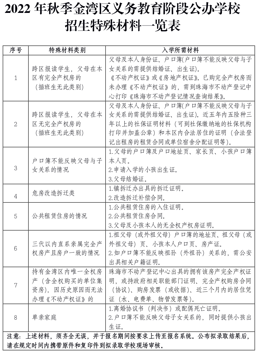 附件4.2022年秋季金湾区义务教育阶段公办学校招生特殊材料一览表