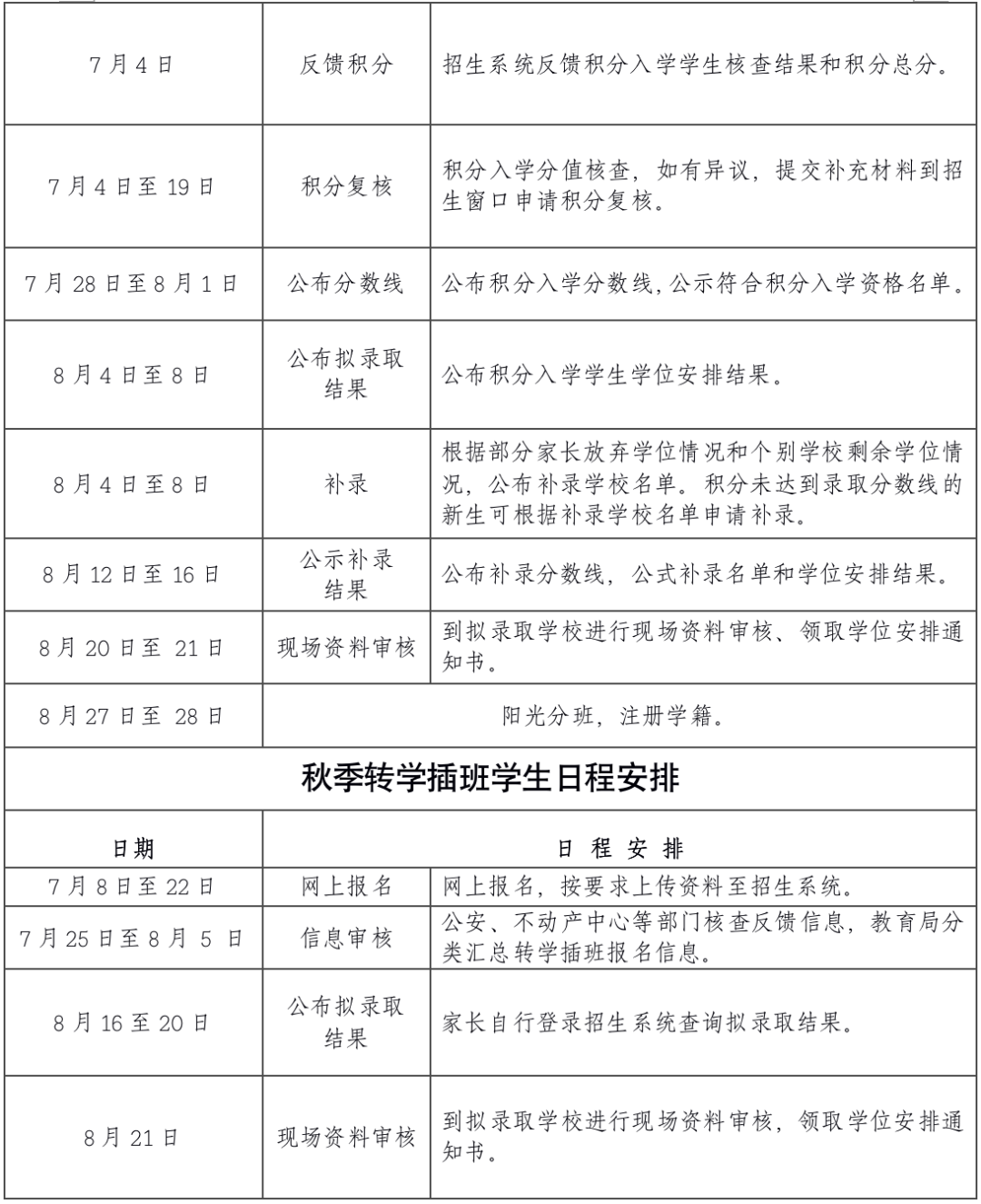 8.发布公办学校积分入学补录通知,公布补录学校名单。(8月4日至8日)