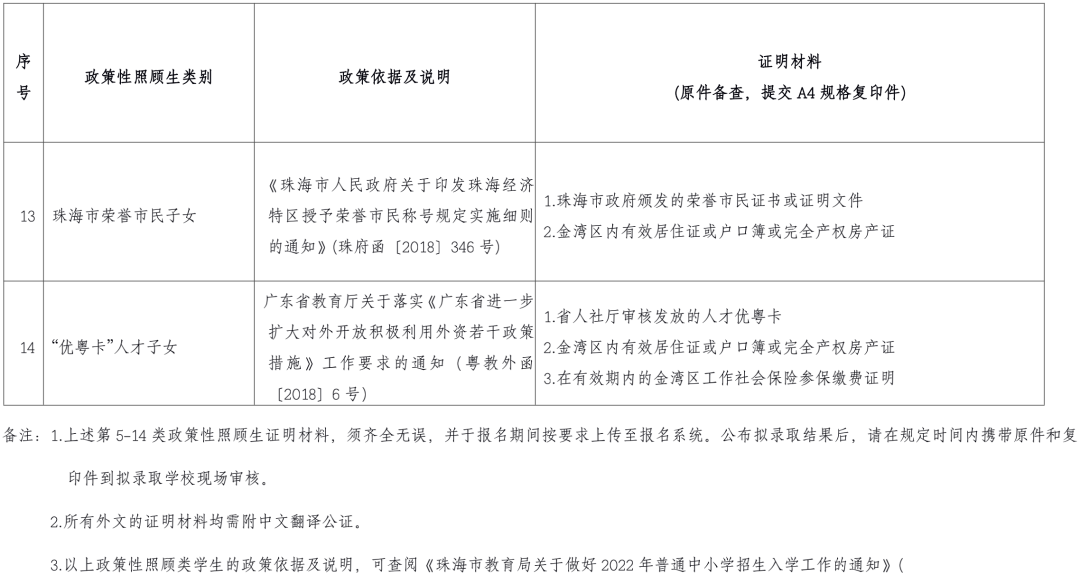 (二)珠海市政策性照顾生材料(见附件2)