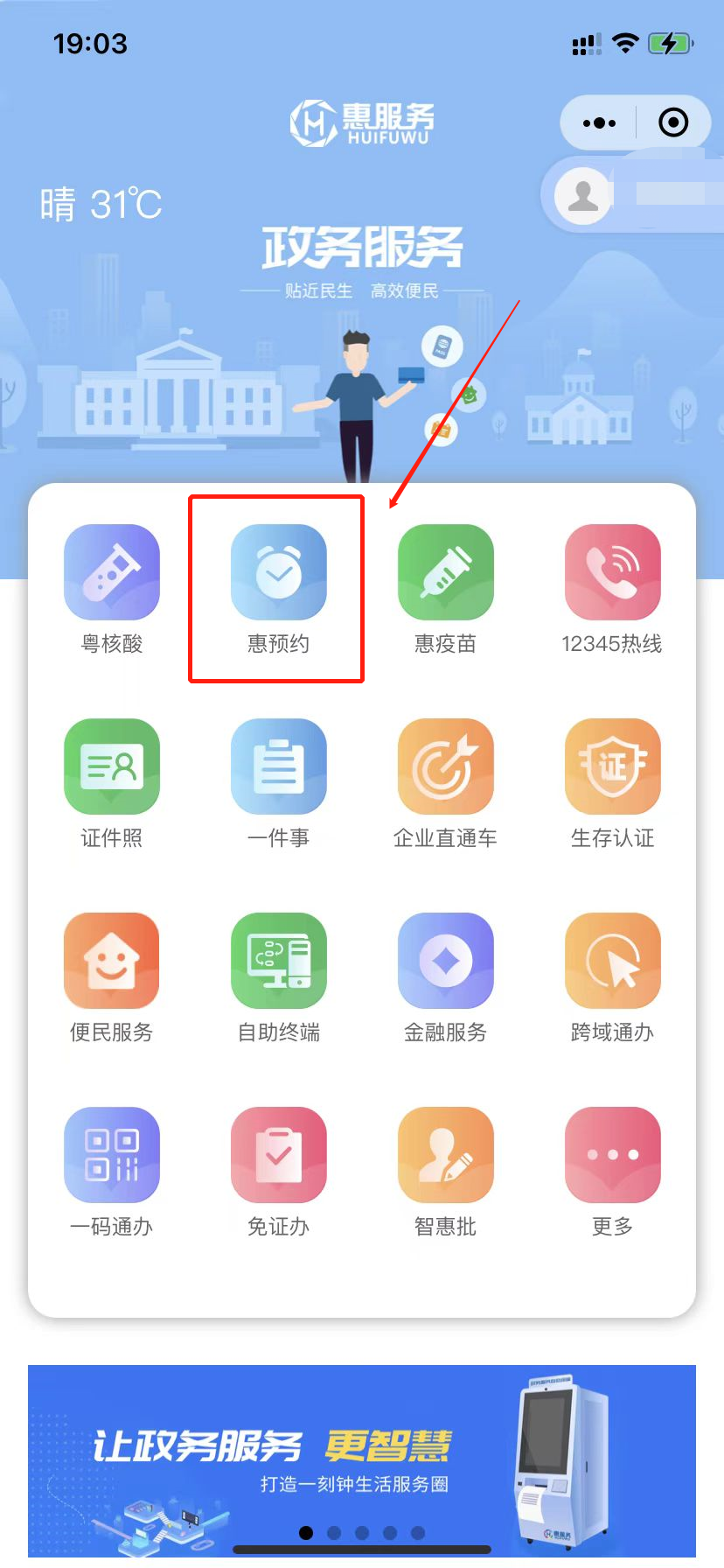 《预约指南》微信搜索“惠服务 U”小程序或点击上方预约入口打开小程序并人脸识别实名登录在“常用功能”模块点击“惠预约”