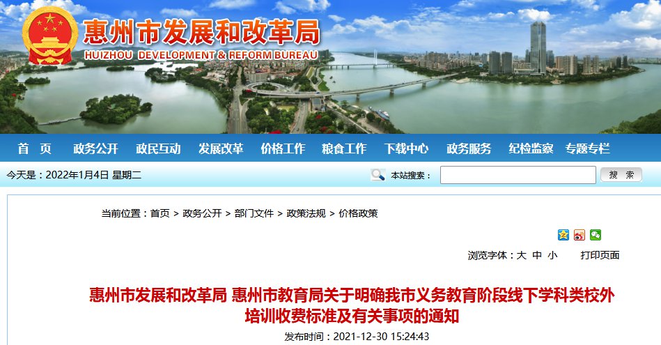 惠州市发展和改革局 惠州市教育局关于明确我市义务教育阶段线下学科类校外培训收费标准及有关事项的通知