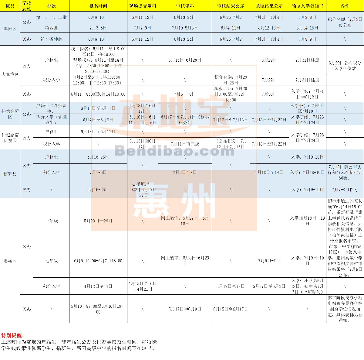| 特别提醒: 上述时间为常规的户籍生、非户籍生公办及民办学校招生时间,如特殊学生或政策性优惠学生、插班生、惠阳高级中学的报名时间不在这里。 | |||||||||